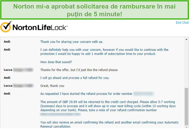 După ce m-am înregistrat la Norton și am folosit serviciile timp de câteva săptămâni, i-am scris unui agent pe chat-ul live. Am intrat în legătură cu cineva în mai puțin de 5 minute, iar cererea mea de rambursare a fost aprobată în doar câteva minute. Mi-am primit banii înapoi de la Norton în doar 5 zile.